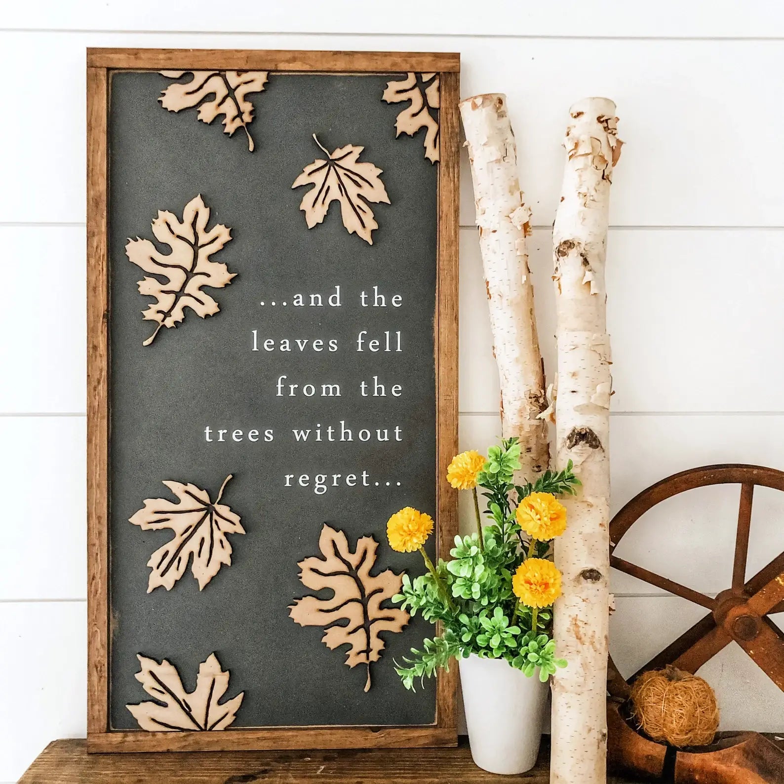 Handmade wooden sign with painted charcoal background with beautiful laser cut leaves and inspirational fall quote. The leaves are laser cut, giving each sign an added dimension. - Size: approximately 12x24". Add about 1/2" to include frame. - Comes with hardware to hang your sign.