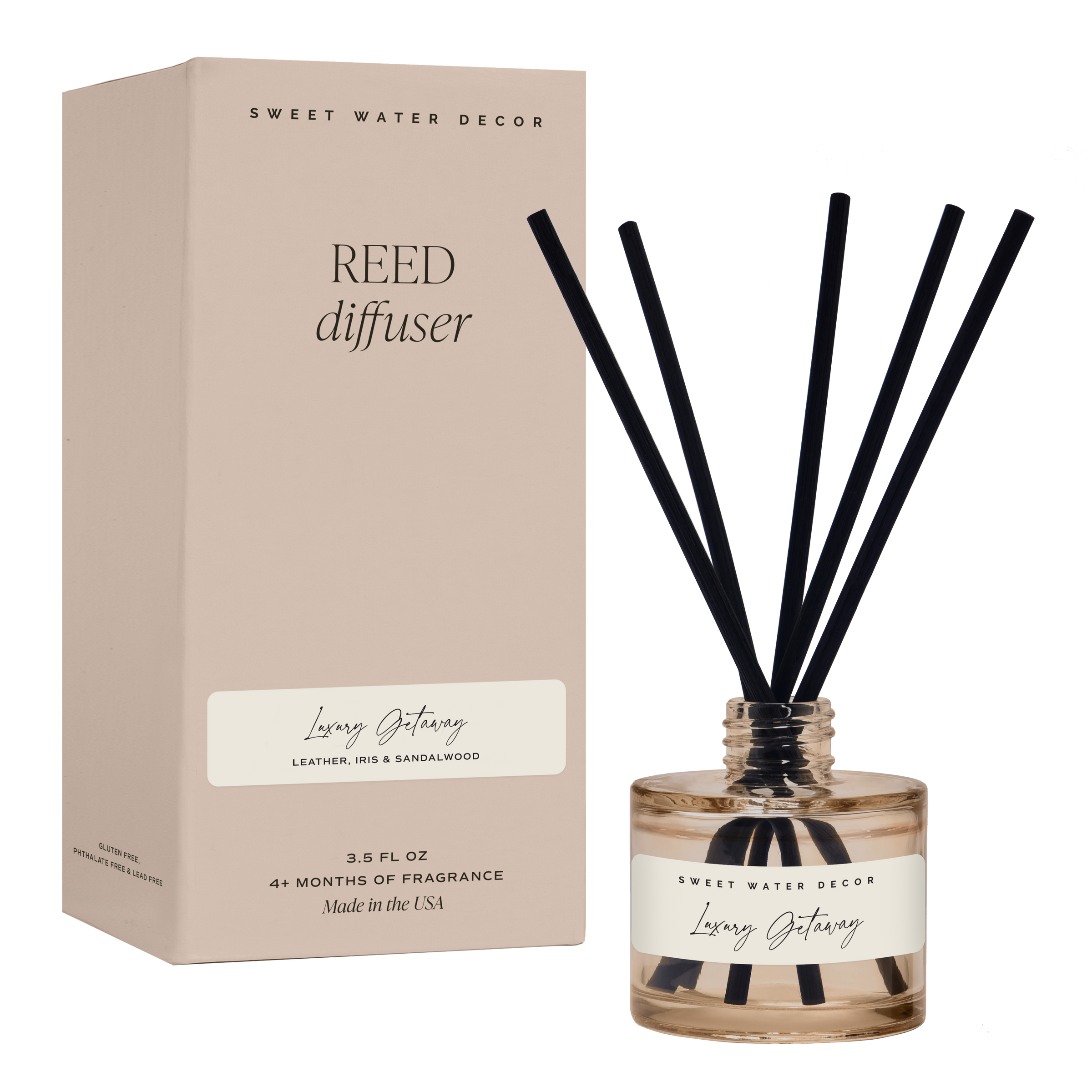 Bring elegance to your shelves with the Luxury Getaway Reed Diffuser. Housed in a tinted beige glass jar, notes of leather, iris, and sandalwood create a warm, upscale ambiance perfect for any space. Just add the reeds, set it, and enjoy months of effortless scent. SCENT NOTES: • Top: Top: Lemon, Leather, Cardamon • Middle: Forest Violet, Cedarwood, Cinnamon • Base: Vetiver, Amber, Musk